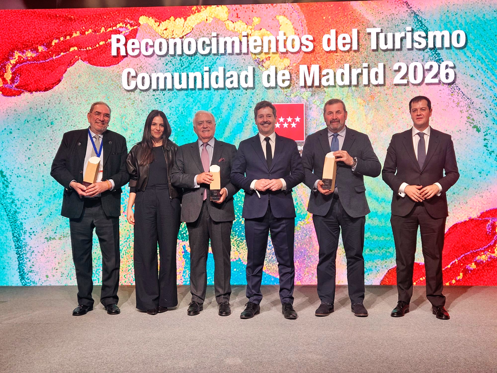 El equipo de Hostelería Madrid también acudió ayer a los primeros Reconocimientos Turísticos de la Comunidad de Madrid. Este premio ha sido concebido para premiar las mejores experiencias, destinos y trayectoria de personalidades y entidades turísticas más reseñables del sector. En esta primera edición la distinción a la mejor experiencia ha recaído en el oleoturismo madrileño; la de mejor destino, en Navacerrada, y la correspondiente a trayectoria profesional, en los 50 años de dedicación del presidente de la Asociación Hotelera de Madrid, Gabriel García Alonso.