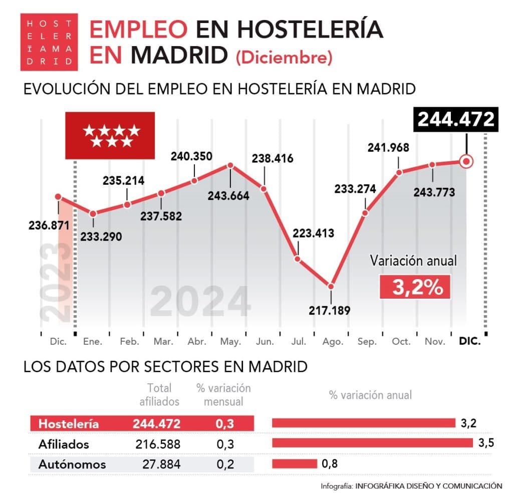 La Hostelería de la Comunidad de Madrid cierra el año 2024 con un total de 244.472 trabajadores, récord de empleo por encima incluso del dato registrado en el mes de mayo (243.664), época de temporada alta en Madrid. El número de trabajadores del sector crece en diciembre un 3,2% respecto al mismo mes del año anterior, con 7.601 trabajadores más que hace justo un año.