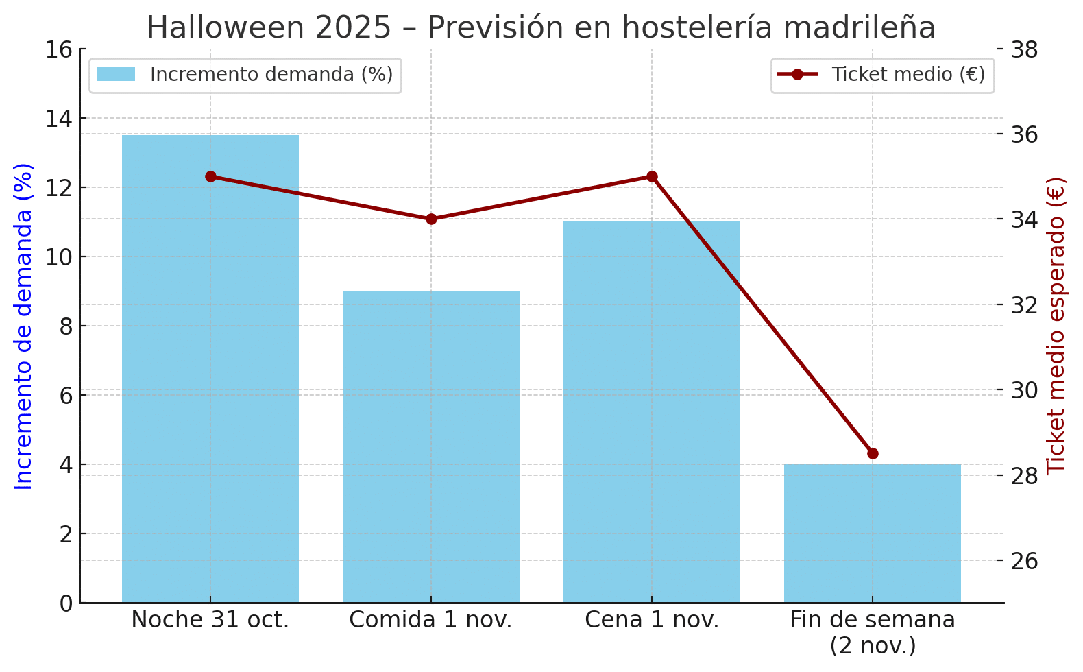 - Ticket medio esperado: entre 33€ y 36€, frente a la media habitual de 27–30€. En 2024 ya se alcanzaron los 35€ en la festividad del 1 de noviembre.