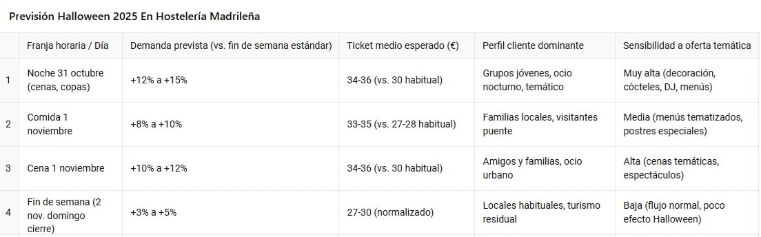 🎃 La hostelería madrileña se prepara para un Halloween con buenas expectativas de consumo, especialmente porque el 1 de noviembre cae en sábado, lo que alarga la celebración y concentra planes entre la noche del viernes 31 y el fin de semana.
