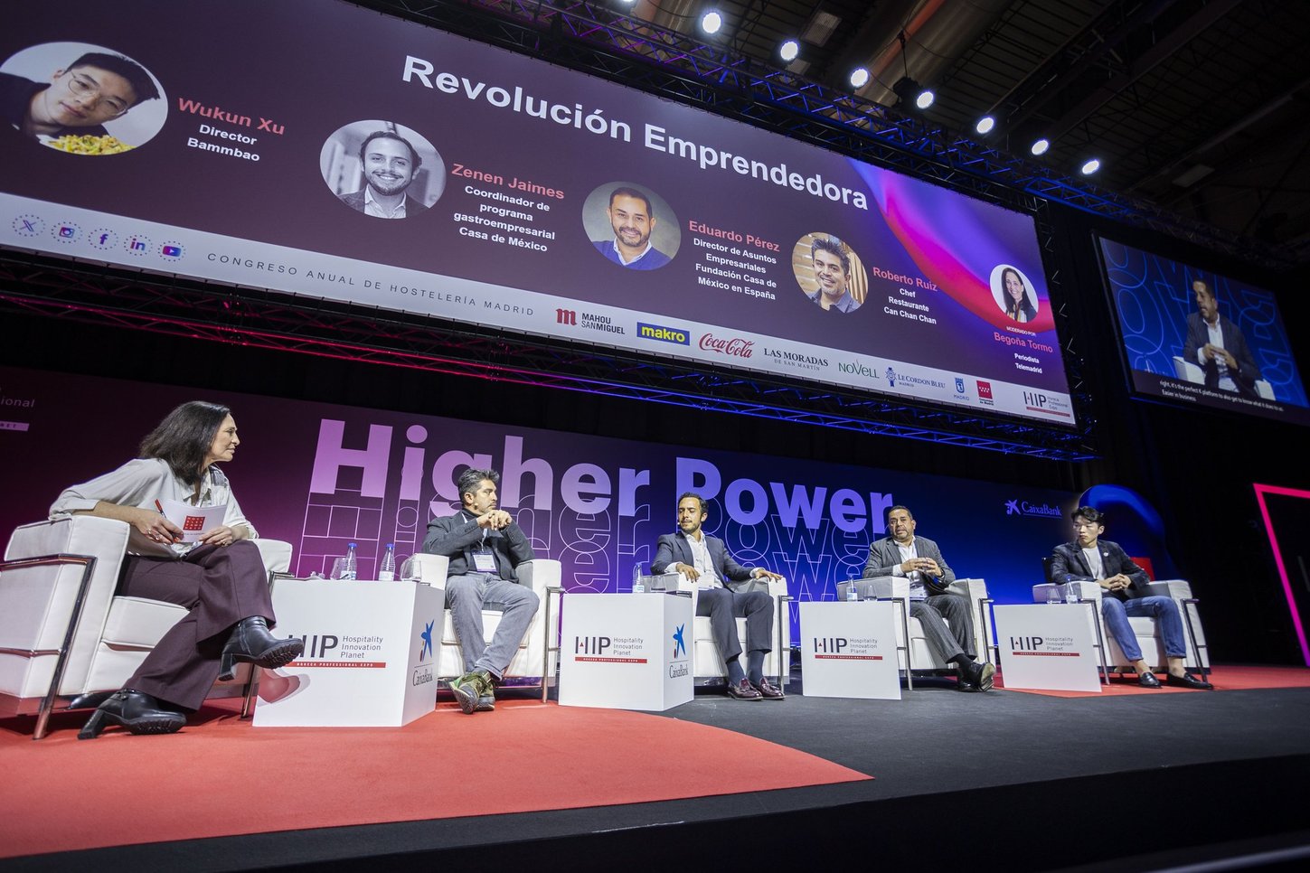 Seguidamente, se dio comienzo a la primera mesa redonda, Revolución Emprendedora, explorando la fuerza innovadora que está redefiniendo el futuro de la hostelería. Los ponentes de esta fueron: Eduardo Pérez, de la fundación Casa México. Zenén Jaimes, coordinador del programa Gastro empresarial de Casa México. Roberto Ruiz, Chef del Restaurante Can Chan Chán, con más de 18 años emprendiendo en España. Wunkun Xu, director del restaurante Bammbao. Cada ponente expuso cómo había sido su trayectoria empresarial asentándose en Madrid, contando sus mayores logros y tratando los secretos del éxito del emprendimiento, coincidiendo en que son la suma de muchos factores, pero, sobre todo, realizar una cocina auténtica, con identidad cruzada, manteniendo la esencia del restaurante. Se resaltó la importancia de tener un perfecto plan de negocio y que sea muy dinámico ante cualquier imprevisto. Además, se hizo gran referencia a la innovación y comunicación en la oferta de un restaurante, y el apoyo que ofrece Hostelería Madrid a los hosteleros poniendo a su disposición la ayuda necesaria para la gestión de sus negocios.