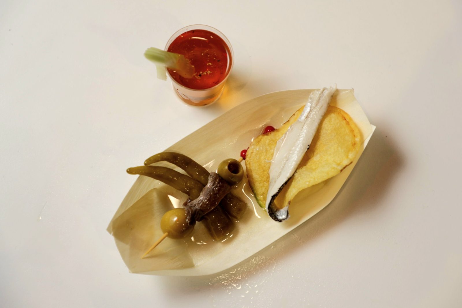 El cóctel de Madrid 2024 ‘Bloody Madryd Santamaría’, elaborado a base de tomate, ha sido maridado en directo con una tapa típica madrileña elaborada por el restaurante Casa Sotero, integrante de la guía Con Solera e icono de la tradición y la calidad de producto en nuestra región. Una gilda clásica con anchoa, acompañada de una patata frita y un boquerón, maridaje perfecto para el cóctel Bloody Madryd del 2024.