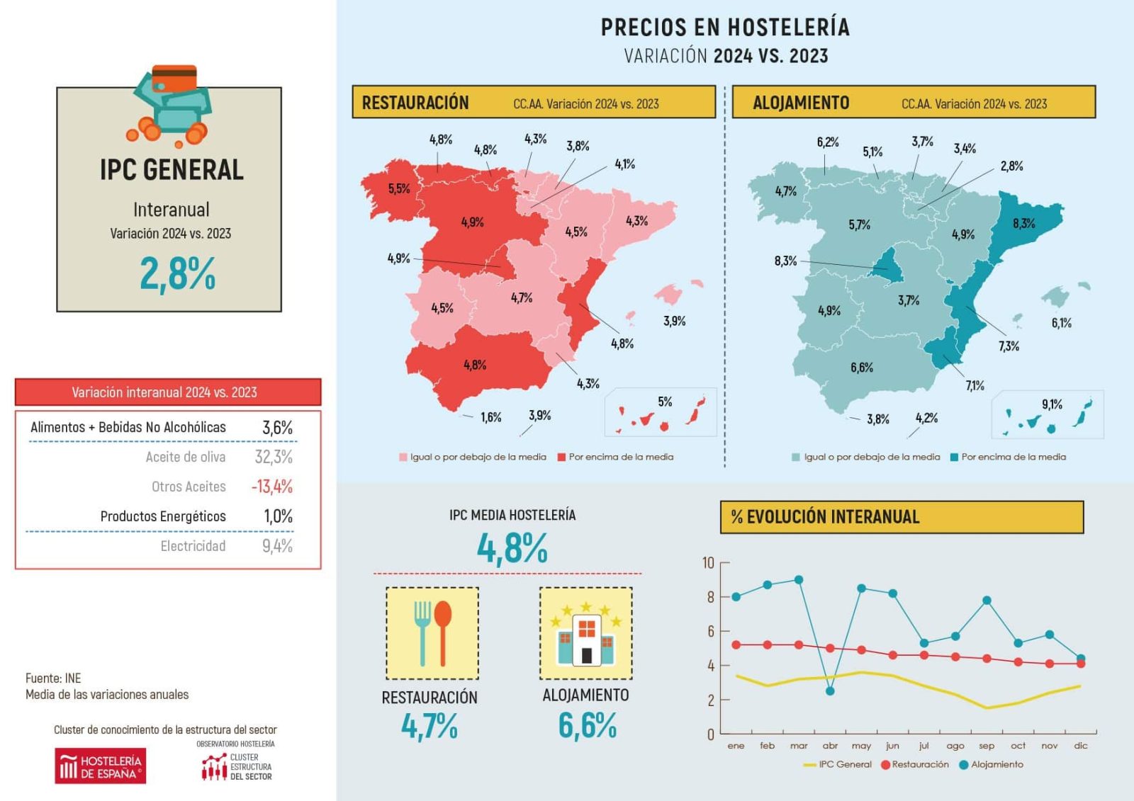 En el conjunto de CC.AA., las actividades de restauración, Asturias se sitúa a la cabeza en diciembre con un aumento del 4,7%, seguida de Aragón (4,6%), Madrid (4,5%), Galicia y La Rioja (4,4% ambas) y Cantabria (4,2%), todas por encima del 4,1% que supone la media. En el lado contrario, Ceuta se mantiene con el aumento más moderado, de un 1,8%. En la media de 2024 Galicia es la que supone el mayor incremento, de un 5,5%, y también por encima de la media nacional del 4,7%, Canarias (5%), Castilla y León y Madrid (4,9% ambas), y Andalucía, Asturias, Cantabria y la Comunidad Valenciana (4,8% en todas). En el lado contrario, Ceuta registra la menor subida, de un 1,6%.
