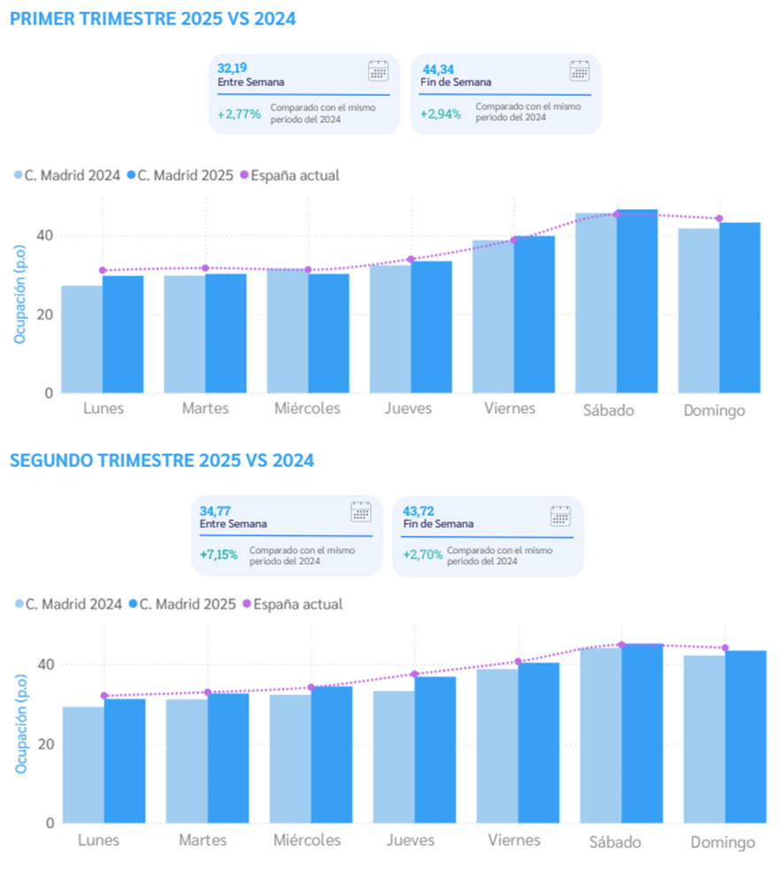 Los datos muestran que la ocupación entre semana ha crecido un 5,81% respecto al primer semestre de 2024, situándose en un 33,66% de media. No obstante, los fines de semana siguen siendo el momento preferido de los madrileños para disfrutar de la hostelería, con una ocupación del 43,98%, un 2,80% más que el primer semestre del año anterior.