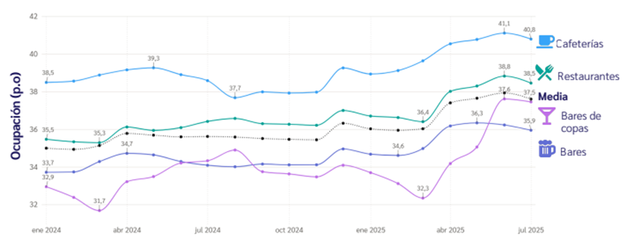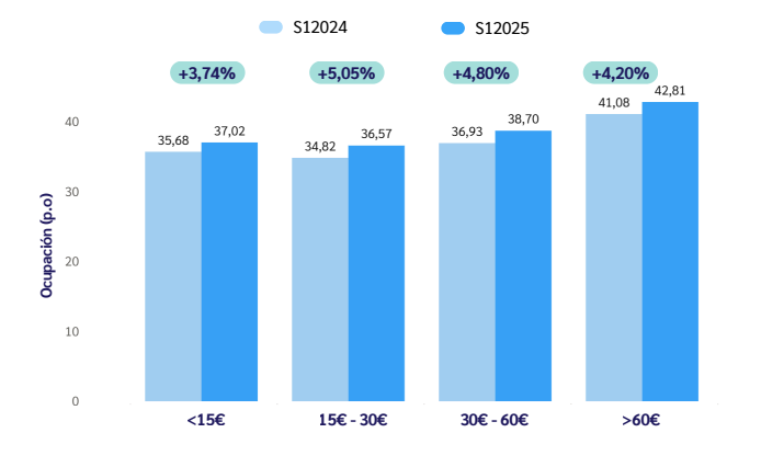 En cuanto a la ocupación por rango de precio, todos los segmentos han experimentado crecimiento: los locales de menos de 15 euros aumentaron un 3,74%; los de 15 a 30 euros, un 5,05%; los de 30 a 60 euros, un 4,80%; y los de más de 60 euros, un 4,20%.