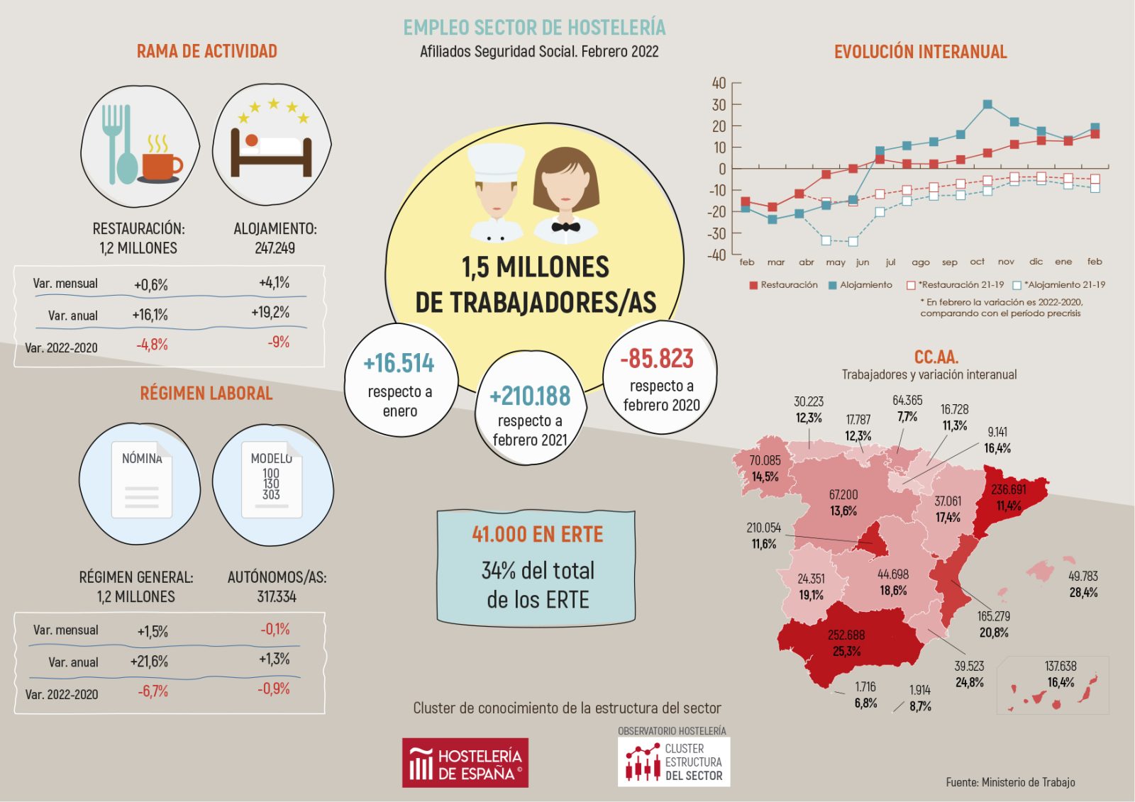 El sector de la hostelería mantuvo el empleo en febrero en cerca de 1,5 millones de trabajadores afiliados a la Seguridad Social, que supone un 16,6% más que en el mismo mes de 2021, según los datos de afiliación del Ministerio de Trabajo. Esta evolución representa un aumento en 210.188 trabajadores respecto a los que había en febrero de 2021. Comparando con febrero de 2020, mes todavía no afectado por la crisis, supone un descenso de un 5,5%, que se traduce en 85.823 afiliados menos, volviéndose a acentuar ligeramente la caída por tercer mes consecutivo.