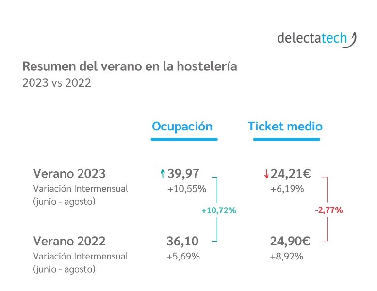 Durante el periodo estival, un 83,92% de los locales han incrementado su ocupación, mientras que un 66,03% ha aumentado el ticket medio. En líneas generales, un 55,43% de los establecimientos han experimentado un aumento tanto de la ocupación como del ticket medio durante el verano de 2023. Asimismo, ha sido un verano con comportamientos dispersos, con establecimientos que ganan por encima de dos dígitos y otros a menos de uno. La diferencia con el año anterior ha sido que los crecimientos o decrecimientos no han sido tan homogéneos en el grueso de los locales.