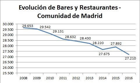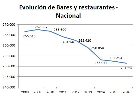 Los bares y restaurantes españoles han ido descendiendo paulatinamente a lo largo de los últimos años con una pérdida neta de 15.225 establecimientos desde el año 2008 hasta la actualidad, registrando en el 2016 un total de 251.390 bares y restaurantes de los 266.615 que había en el año 2008.
