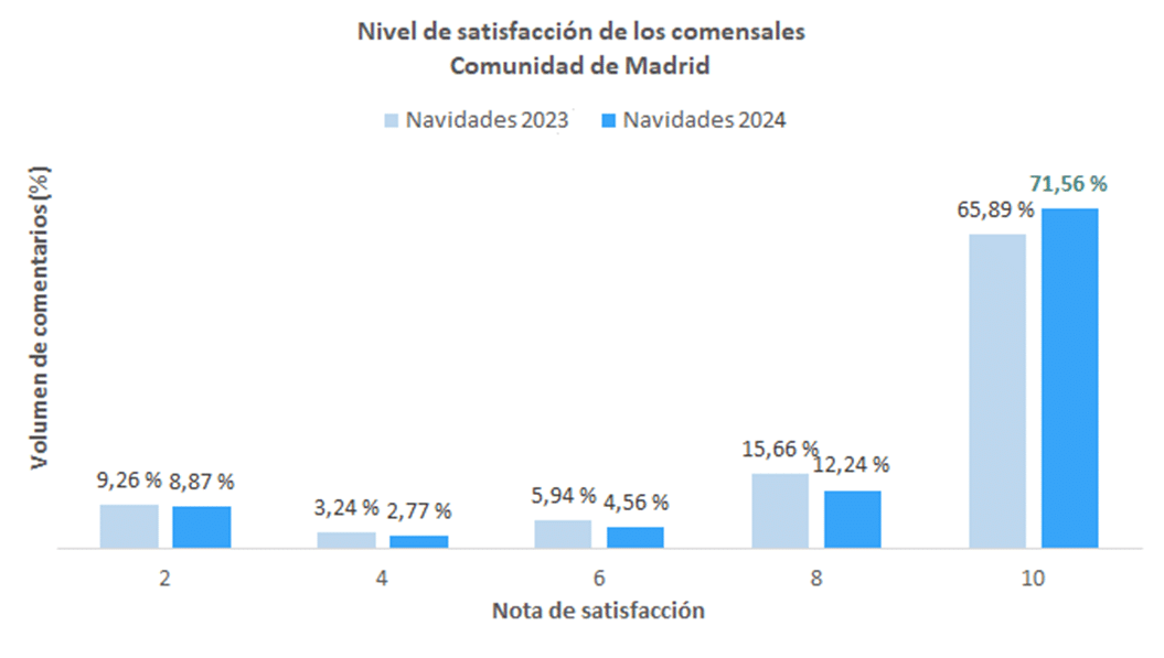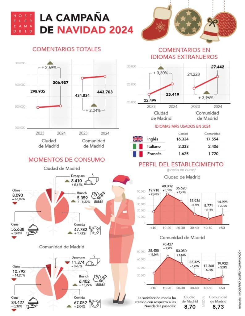 Madrid, 14 de enero de 2024.- Durante la temporada navideña de 2024 en la hostelería de Madrid se ha observado un aumento en el número de comentarios respecto al año anterior, lo que sugiere una destacada actividad en los establecimientos de restauración durante este periodo navideño, probablemente impulsada por una mayor afluencia de comensales. Este incremento se registró tanto a nivel autonómico, en la Comunidad de Madrid (+2,04%), como en la ciudad de Madrid (+2,69%), según el informe realizado por la consultora Delectatech para Hostelería Madrid sobre los resultados de la campaña de Navidad 2024 en comparación con la campaña del 2023.