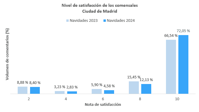 La valoración media de los clientes a la hostelería en esta campaña de Navidad ha sido de un 8,7 sobre 10 tanto a nivel de MUNICIPIO COMO DE Comunidad de Madrid, dos décimas porcentuales por encima de la valoración media de la campaña de Navidad de 2023. Además, más del 70% de los clientes han valorado su nivel de satisfacción en un 10.