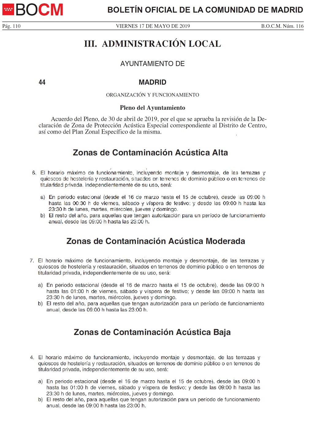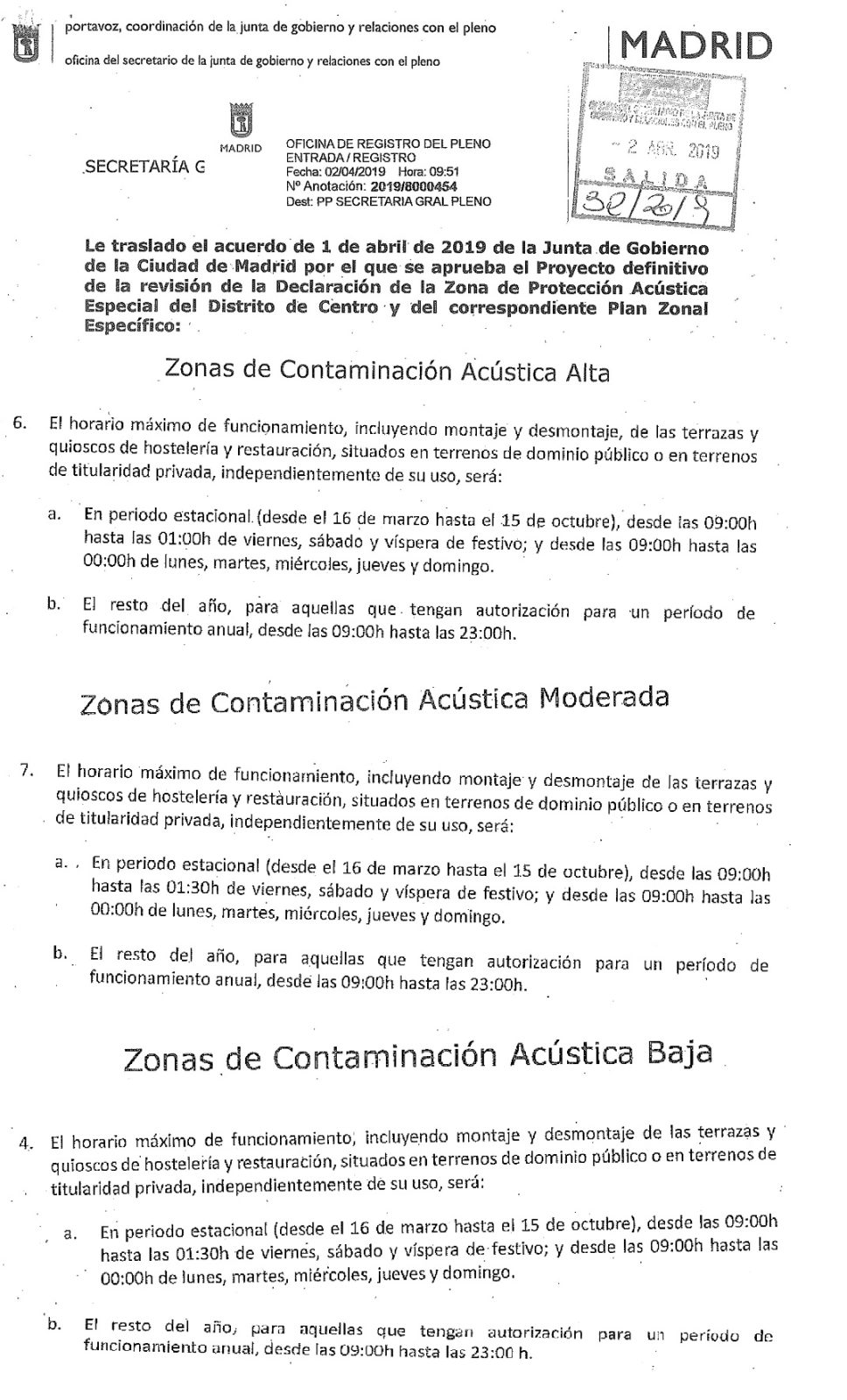 El proyecto definitivo aprobado por la Junta de Gobierno el 1 de abril de 2019 recoge un adelanto de una hora por la mañana en el horario de apertura de las terrazas y un recorte generalizado en su horario de cierre a pesar de haber mejorado los niveles de ruido en el distrito Centro de Madrid. El recorte horario quedaba fijado tal y como se aprecia en la imagen siguiente del Proyecto definitivo de la ZPAE de la Junta de Gobierno de la ciudad de Madrid según la zona de protección acústica: