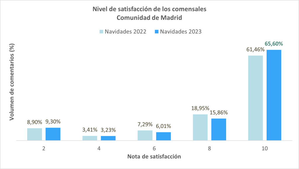 Madrid, 10 de enero de 2024.- La asociación Hostelería Madrid concluye su campaña de Navidad de 2023 con una valoración ‘sobresaliente’ por parte de los clientes sobre su experiencia en los bares y restaurantes de la región durante la campaña de Navidad. El 65,6% valoran con un 10 sobre 10 su experiencia en los bares y restaurantes de la región; seguidos del 15,8% de los clientes, que la valoraron con un 8 sobre 10; un 6% la valoraron con un 6 sobre 10; el 3% la suspenden con un 4 y un 9% con una valoración de 2 sobre 10, según el estudio realizado por Hostelería Madrid y la consultora Delectatech sobre los resultados de la campaña de Navidad 2023.