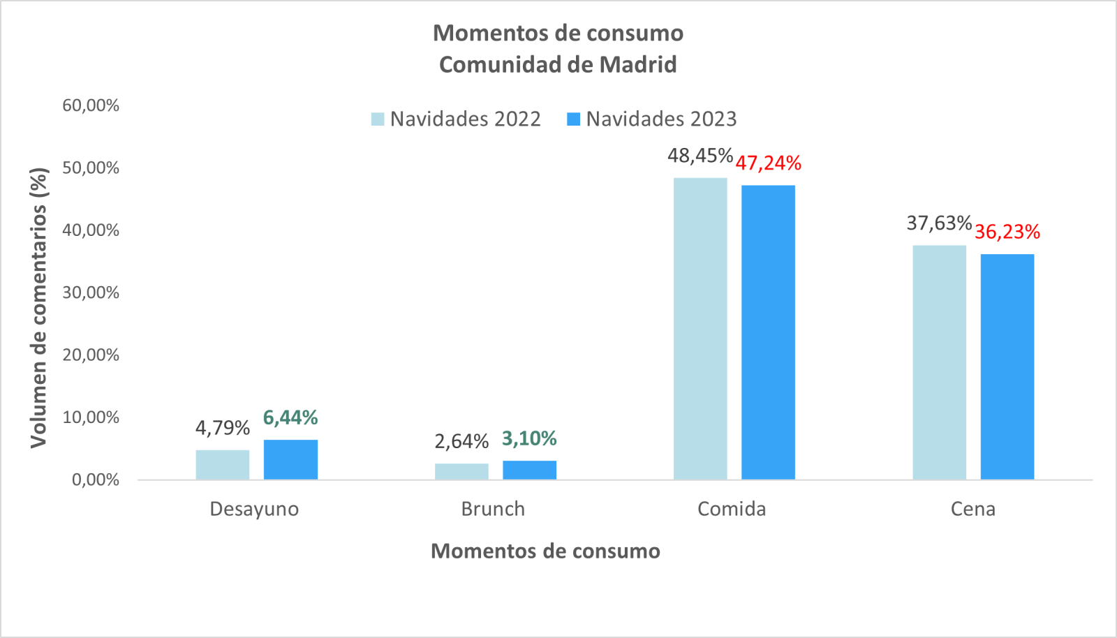 - • Momentos de Consumo Destacados: Aunque la comida sigue siendo el momento más destacado, con un 47% de los comentarios, tanto el desayuno como el brunch experimentaron notables incrementos en el número de comentarios, indicando una creciente preferencia por estas opciones durante las vacaciones de Navidad.