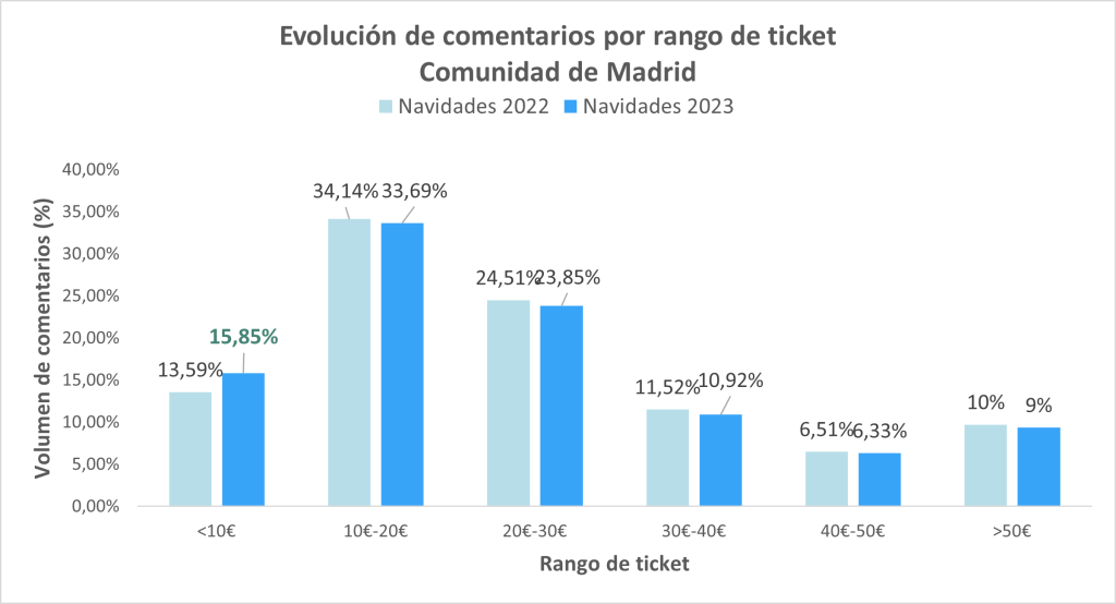 Por rango de tique medio, el mayor volumen de comentarios, un 33,7%, se ha concentrado en los rangos de precio de 10 € a 20€; seguidos de los rangos de 20€ a 30€, que acapararon casi el 24% de los comentarios.