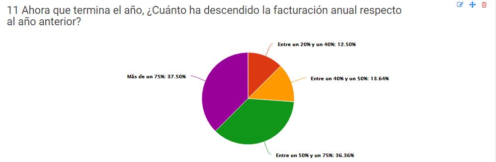 Con el cierre de la campaña de Navidad, termina también el año más complicado para el sector HORECA y confirma la tendencia en el descenso del consumo y la situación insostenible para 12.000 empresas de hostelería de las 32.000 de la Comunidad de Madrid. El 37,50% de los empresarios encuestados han reportado un descenso en la facturación superior al 75%, con respecto al 2019. Mientras que el 36,36% informa de una caída de ventas entre 50% y 75%; un 13,64 ha perdido en 2020 entre 40% y 50% de su facturación y un 12,50% reportó una baja de entre 20% y 40%, con respecto al año anterior.