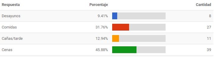 Las cenas han sido el servicio de consumo más afectado por la pandemia según 45,88% de los encuestados; seguido por: las comidas (37,76%), las cañas/tarde (12,94%) y los desayunos (9,41%.)