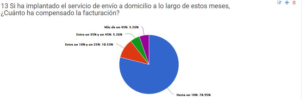 El envío a domicilio ha representado un pequeño alivio para los locales que han decidido ponerlo en práctica. De los que lo han empezado con este servicio (solo un 16% del total), el 78,95% de los empresarios afirman que el delivery compensó con hasta 10% de la facturación; el 10,53% de los locales aumentó su facturación entre 10% y un 25%, un 5,26% ha llegado a facturar en 2020 entre 35% y 45% de su facturación total, y solo un 5,26% compensó más del 45% de su facturación gracias al envío a domicilio durante el 2020.