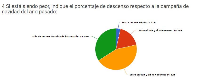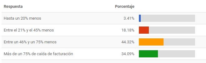 Un 97,8% de los encuestados concuerdan en que la Campaña 2020 fue peor que la del 2019, con descensos importantes en la facturación en casi todos los casos. Para el 44,3% de los encuestados, la caída en la facturación estuvo entre 46% y 75% con respecto al 2019; el 34,09% de los empresarios reportó una baja superior al 75%; mientras que 18,18% estimó pérdidas entre el 21% y el 45%; y el 2,41% restante calculó una caída inferior al 20% , con respecto al año previo.