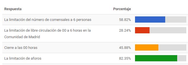 La limitación de lo aforos ha sido la principal causa de la caída en la facturación para un 82,35% de los encuestados. Seguida por la limitación de los aforos (58,82%), el cierre a las 00:00 h (45,88%) y la limitación de la libre circulación entre las 00:00 h y la 06:00 h (28,24%).
