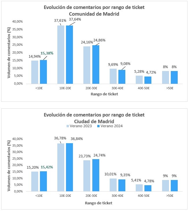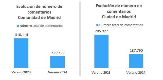 - • En la comparativa interanual, se observa una disminución de comentarios del 9,65% en la Comunidad de Madrid y del 8,81% en el municipio de Madrid en el verano de 2024, en comparación con el verano anterior, lo que denota un descenso de afluencia de clientes y, por tanto, de actividad en los establecimientos.