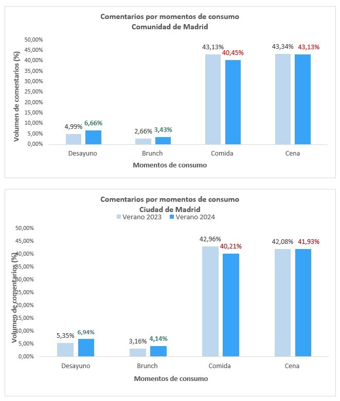 Durante el verano de 2024, tanto en la Comunidad de Madrid como en la ciudad de Madrid se aprecia un incremento en el desayuno y el brunch, destacándose una variación en las preferencias de consumo comparado con el año anterior. Este cambio subraya un aumento significativo en la importancia de los momentos de consumo matutinos durante el verano, en comparación con otras franjas horarias.