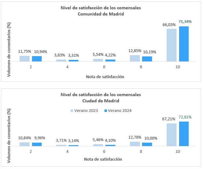 - • Más del 70% de los clientes otorgan una valoración máxima de 10 a la hostelería de Madrid este verano, con un incremento de más de cinco puntos porcentuales respecto al verano pasado.