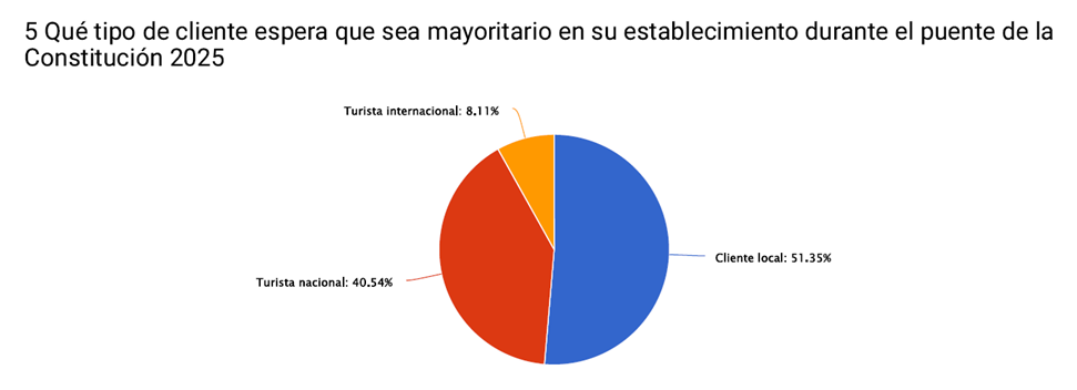 El estudio confirma el peso clave del cliente residente: el 51% de los hosteleros espera que el mayor volumen de consumo proceda del cliente local, seguido del turista nacional (41%). Solo un 8% sitúa al turista internacional como su principal tipo de cliente durante el puente.
