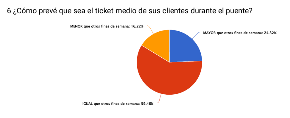 En cuanto al ticket medio, un 59% de los establecimientos espera un gasto similar al de otros fines de semana, mientras que un 24% cree que el ticket será mayor y un 16% pronostica un gasto medio más bajo.